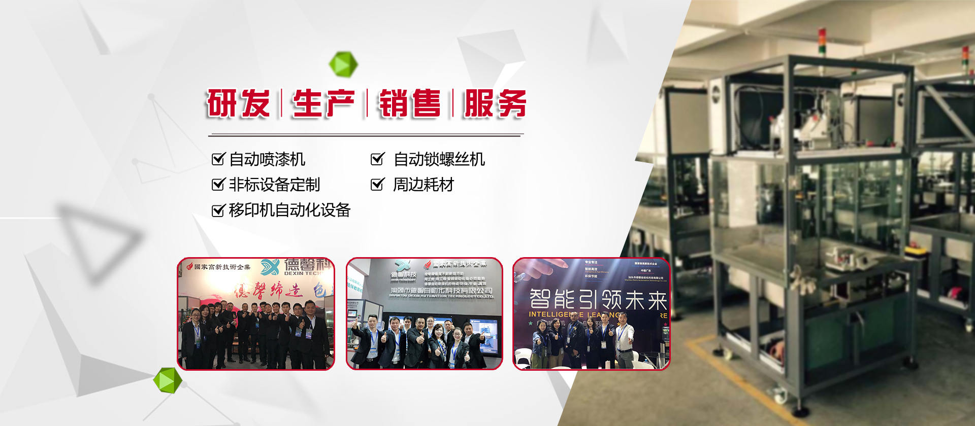德馨科技創(chuàng)立以來,以改變噴印業(yè)傳統手工生產模式為目標,產品開發(fā)制造堅持以“環(huán)保、智能”為理念,為企業(yè)的生產環(huán)境、人力成本、生產效率等提供更為優(yōu)良的服務和技術支持。公司研發(fā)產品主要有自動化噴漆機械、噴漆模具制作等;生產銷售移印機械及移印相關耗材,包括菲林設計輸出;鋼板制作、移印膠頭制作、定位制作及周邊配件耗材并提供完善的售后服務支持。